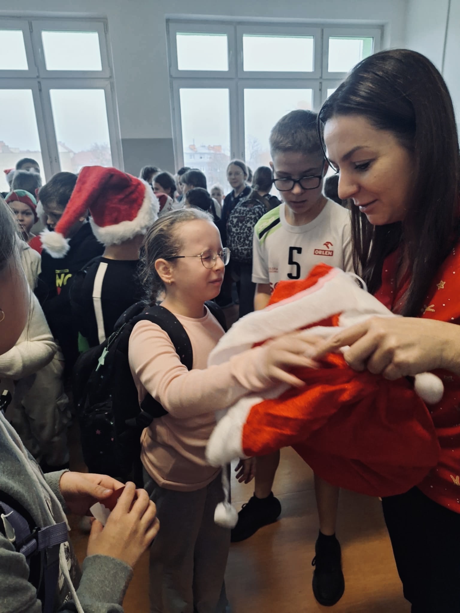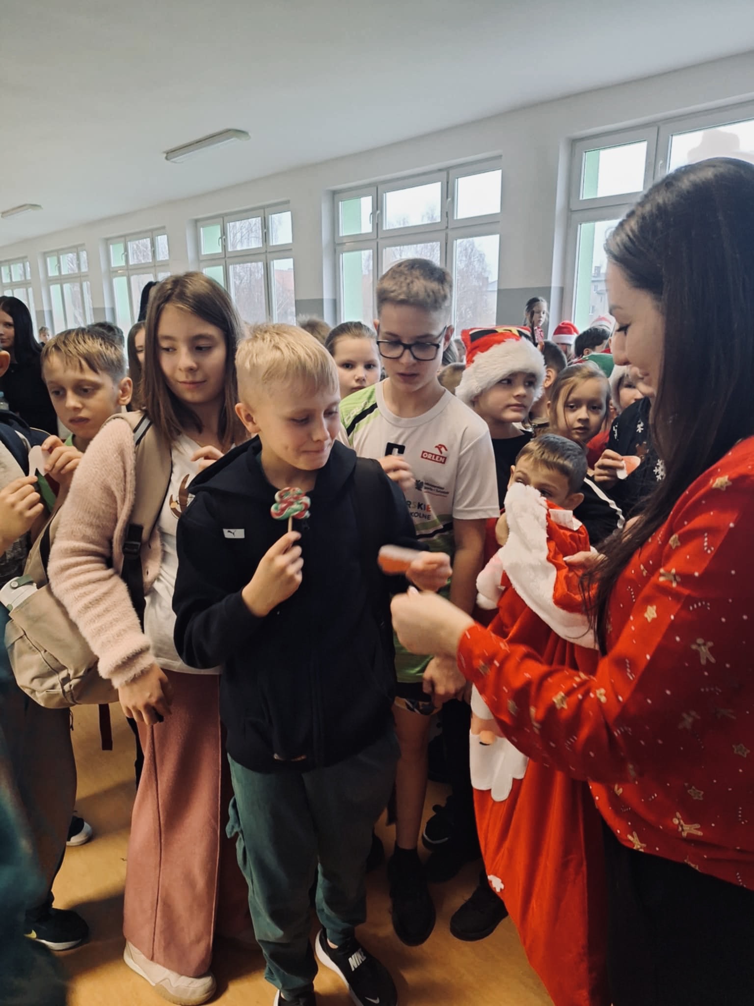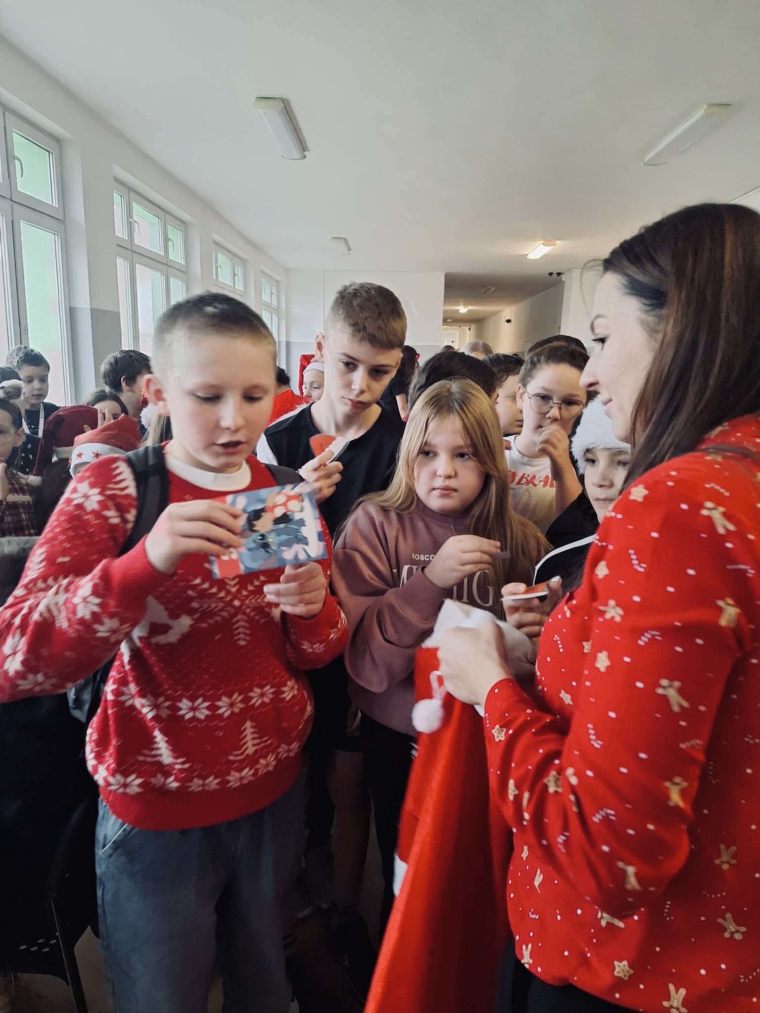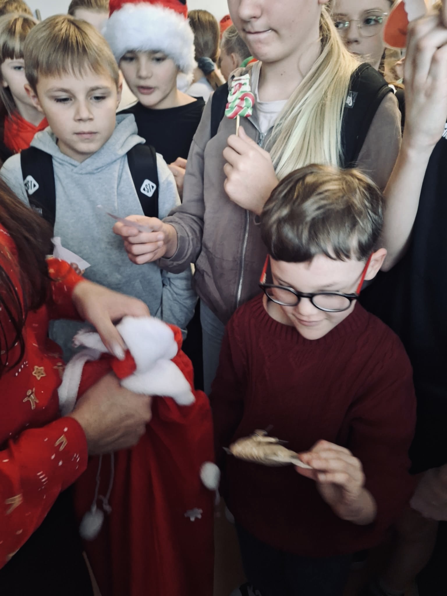Samorząd Uczniowski przygotował świetną zabawę — na korytarzach ukryto ponad 160 czapek Mikołaja, które uczniowie mogli znaleźć i wymieniać na małe nagrody.
