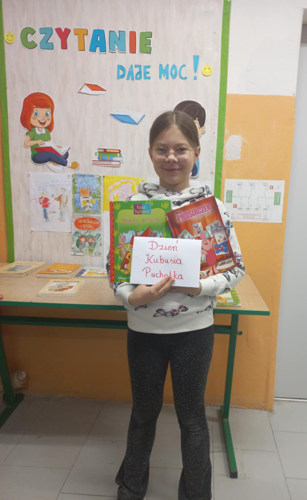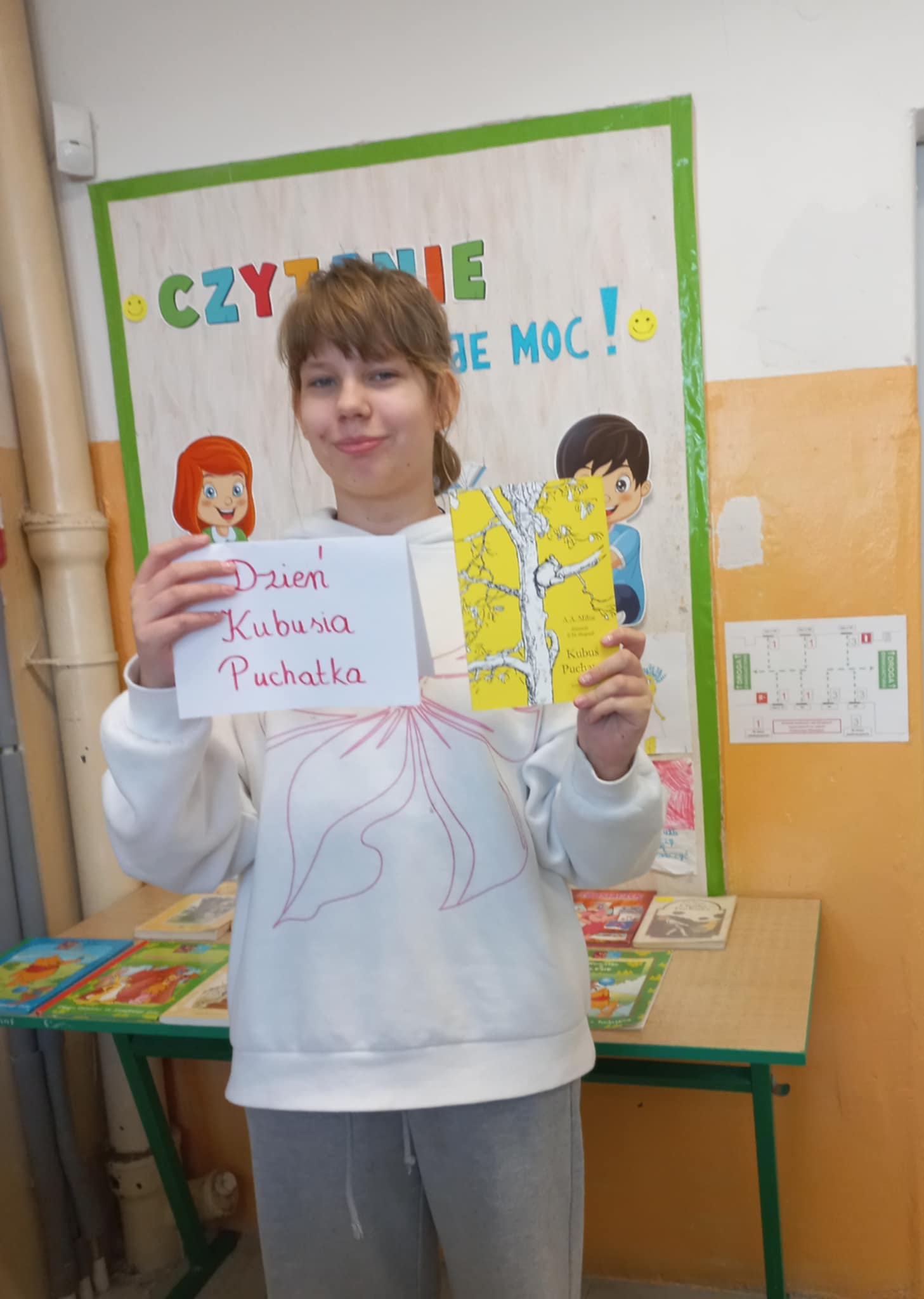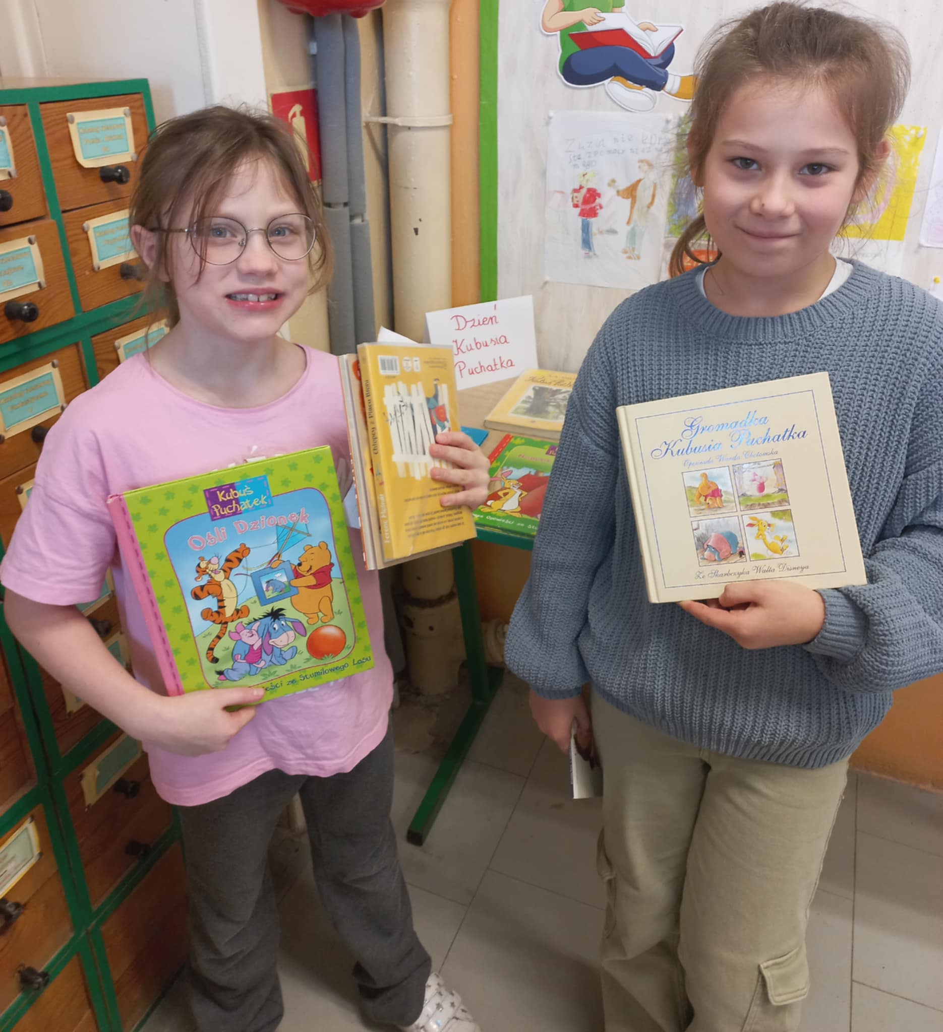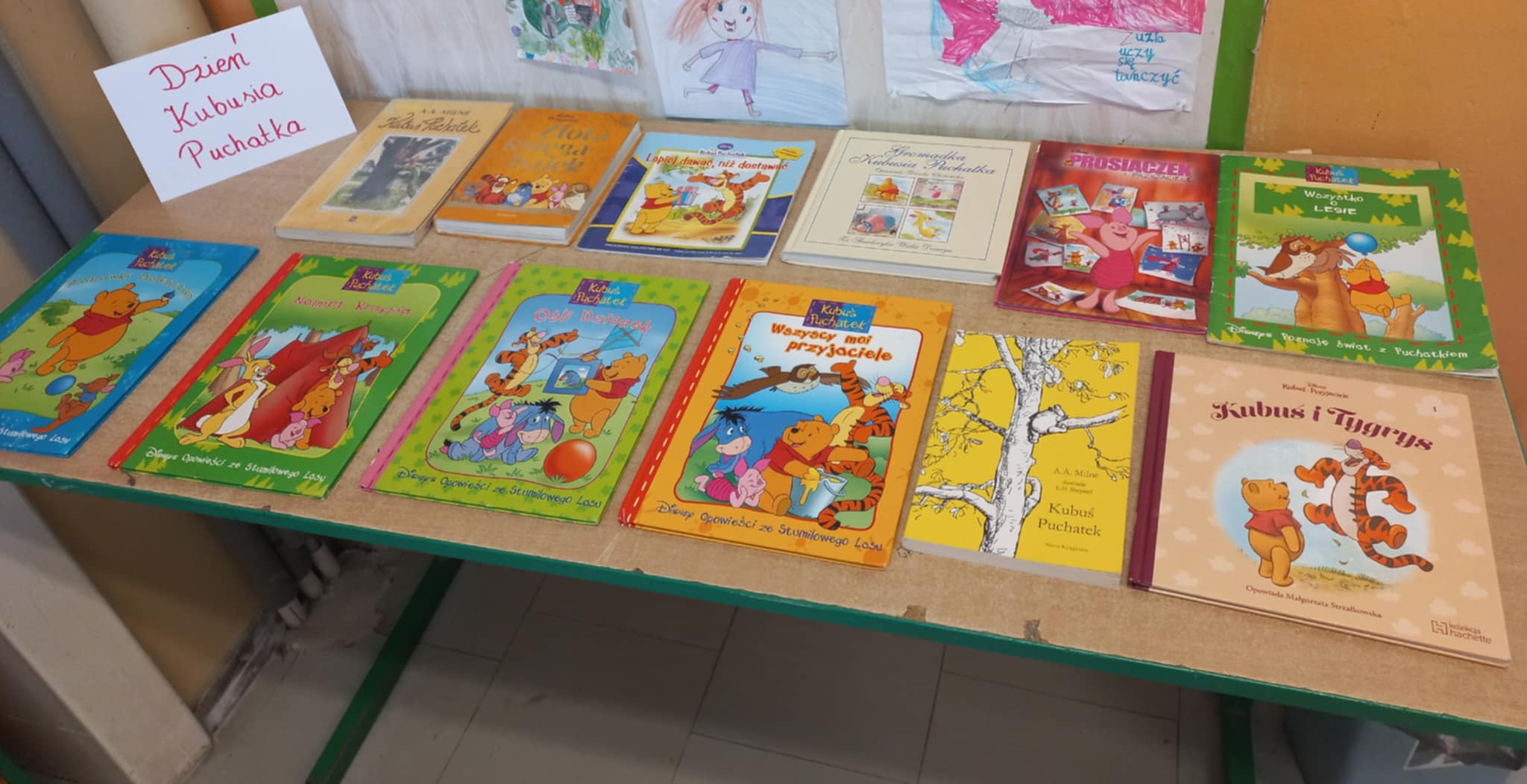Z tej okazji w bibliotece szkolnej była wystawa książek o przygodach Kubusia Puchatka, a cały tydzień podczas przerw w bibliotece, chętne dzieci mogły wziąć udział w odgadywaniu zagadek o Puchatku.
