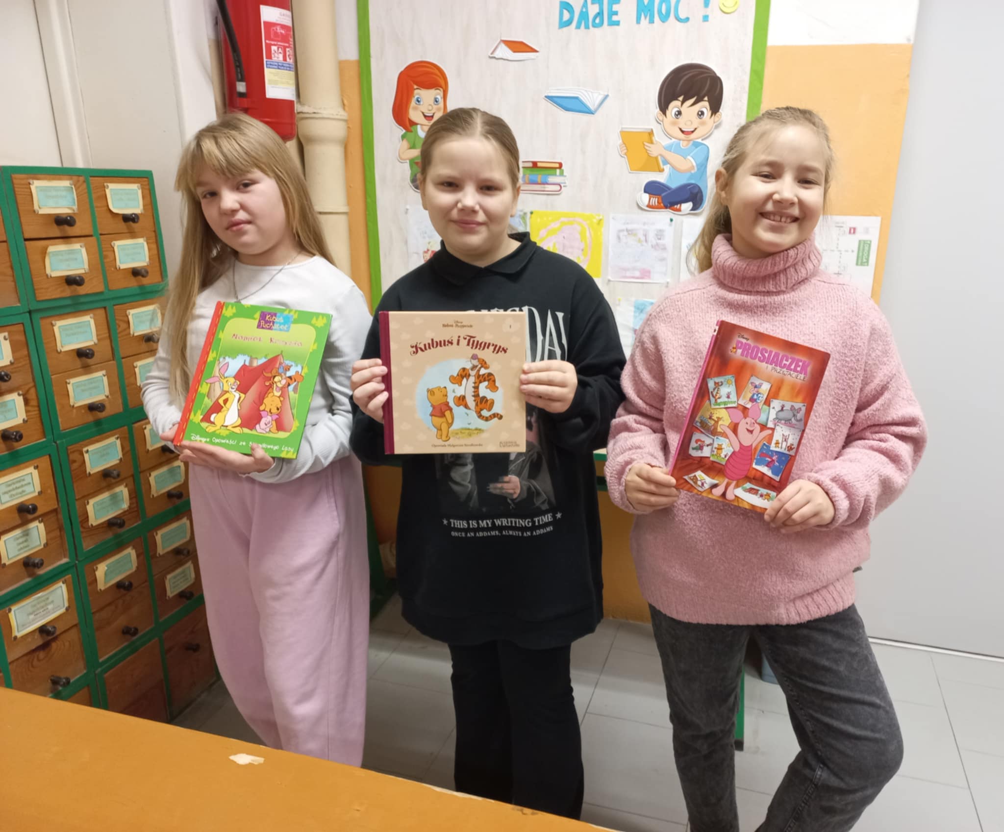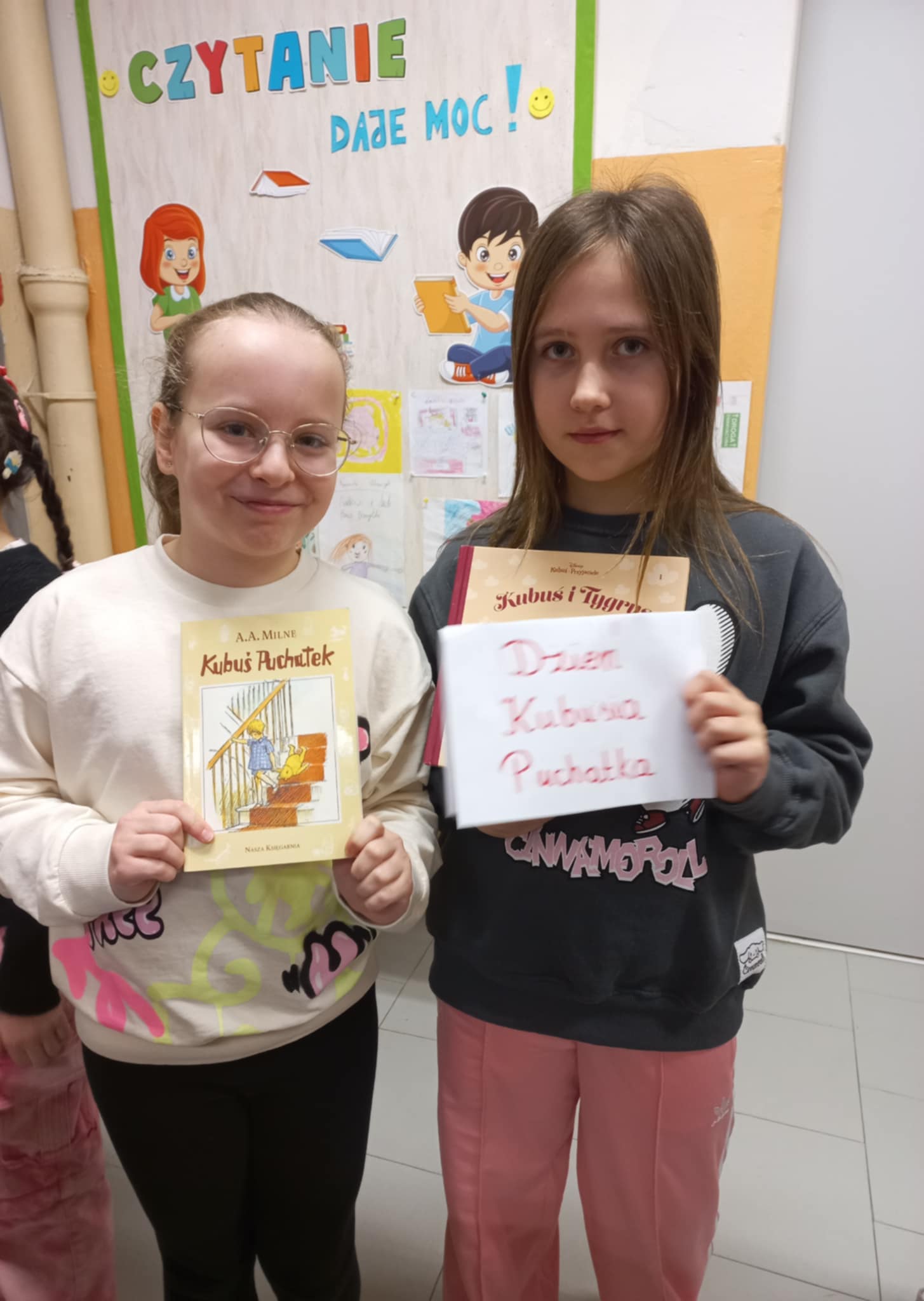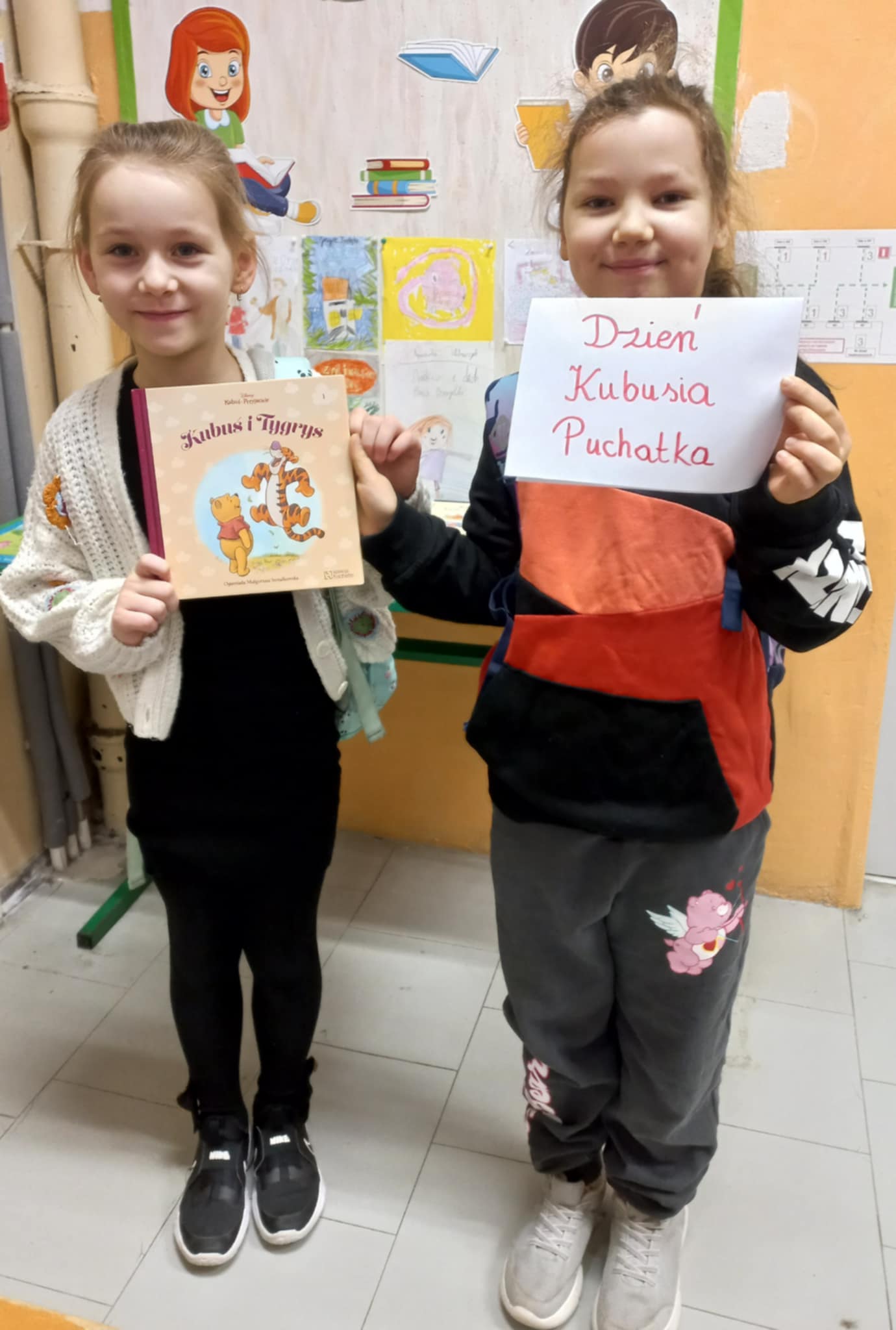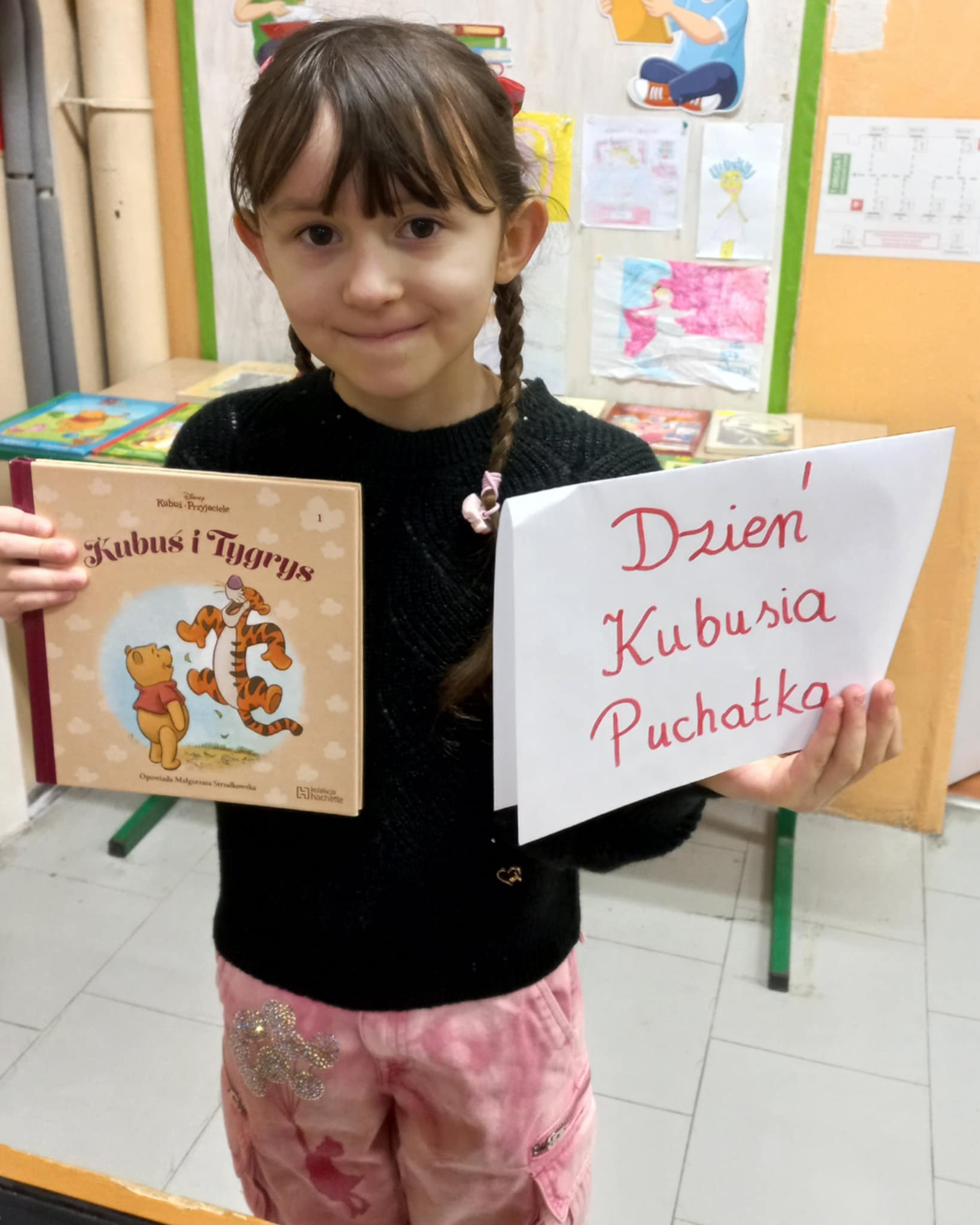 Z tej okazji w bibliotece szkolnej była wystawa książek o przygodach Kubusia Puchatka, a cały tydzień podczas przerw w bibliotece, chętne dzieci mogły wziąć udział w odgadywaniu zagadek o Puchatku.
