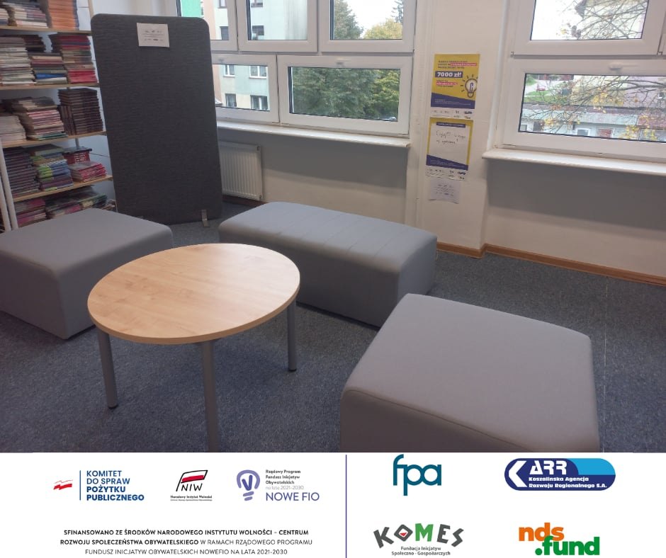 Kącik czytelniczy w naszej bibliotece stworzony dzięki realizacji projektu: „CzytajMy – tu zaczyna się wyobraźnia!”