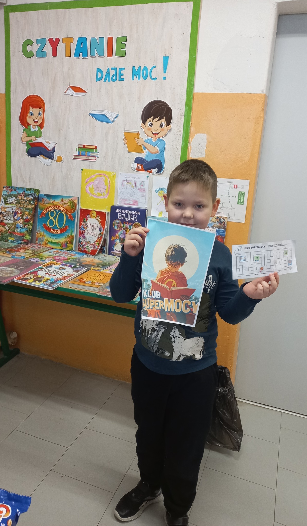 Podsumowanie akcji czytelniczej w ramach programu "Biblioteka - dobre miejsce dla człowieka". Chętni uczniowie zgłosili się do biblioteki i wstąpili do "Klubu Supermocy". Mieli za zadanie przeczytać cztery książki z różnych kategorii i zrealizować dwa wyzwania, związane z czytaniem. Wyzwania polegały na wykonaniu ilustracji wybranej książki i zachęceniu kolegi lub koleżanki do odwiedzenia biblioteki. Uczniowie po przeczytaniu książek i krótkim streszczeniu ich treści, zdobywali kolejne supermoce: moc odwagi, moc mądrości, moc magii i moc świadomości, dążąc do miana superbohaterów. Gratulacje dla uczniów, którzy ukończyli zadanie i przekonali się, że czytanie daje moc!
