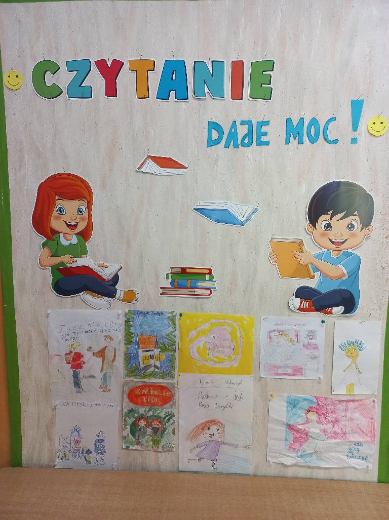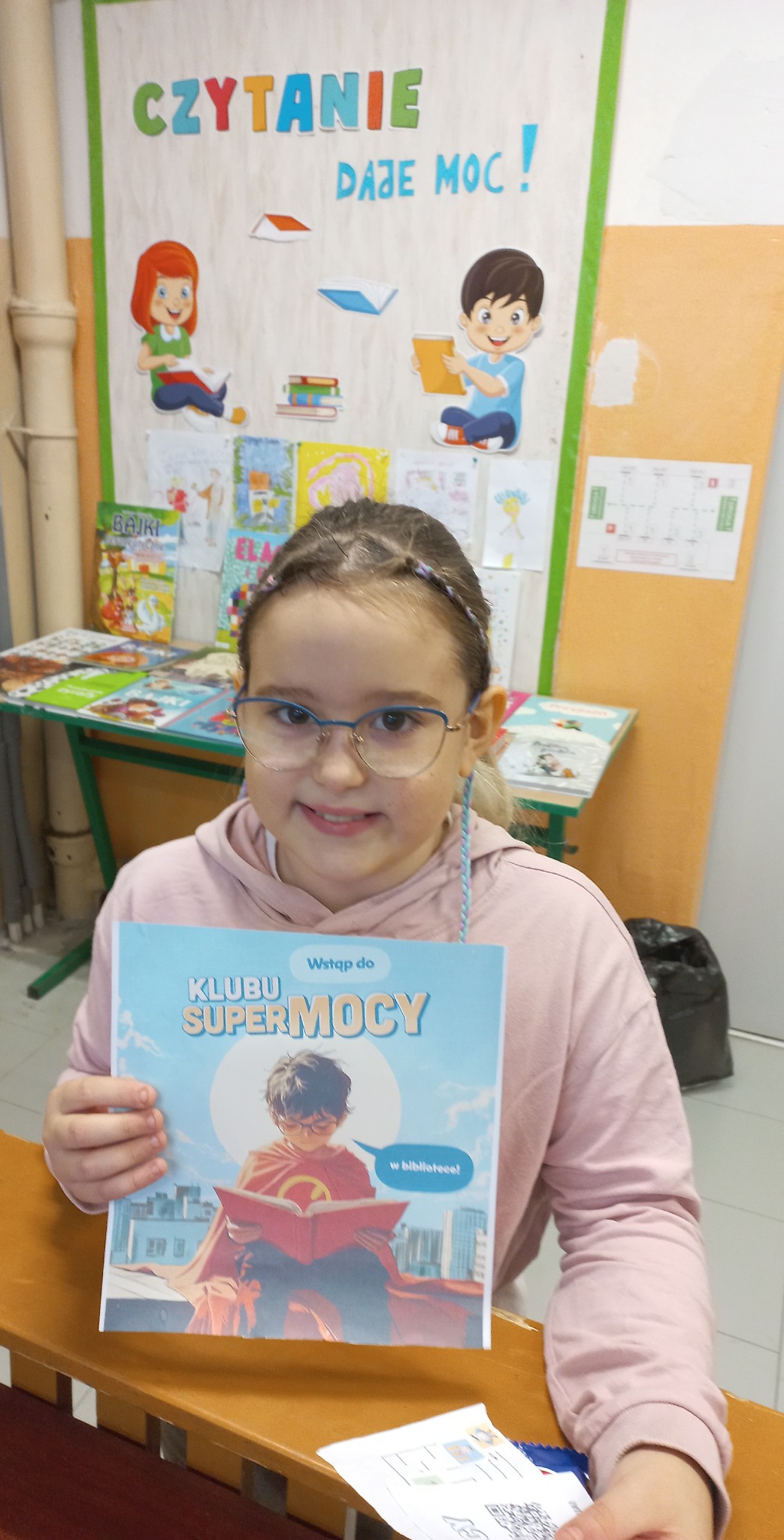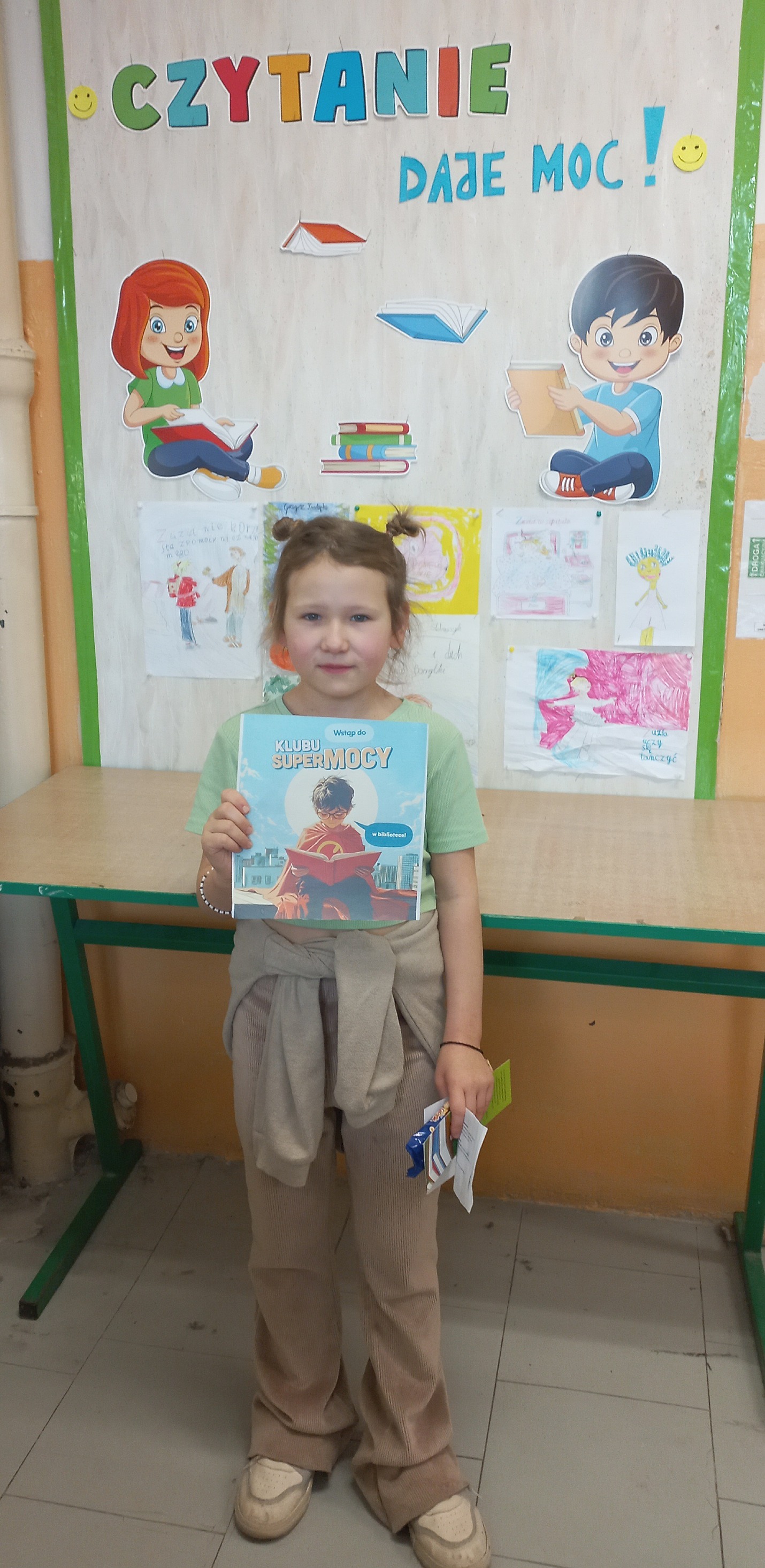 Podsumowanie akcji czytelniczej w ramach programu "Biblioteka - dobre miejsce dla człowieka". Chętni uczniowie zgłosili się do biblioteki i wstąpili do "Klubu Supermocy". Mieli za zadanie przeczytać cztery książki z różnych kategorii i zrealizować dwa wyzwania, związane z czytaniem. Wyzwania polegały na wykonaniu ilustracji wybranej książki i zachęceniu kolegi lub koleżanki do odwiedzenia biblioteki. Uczniowie po przeczytaniu książek i krótkim streszczeniu ich treści, zdobywali kolejne supermoce: moc odwagi, moc mądrości, moc magii i moc świadomości, dążąc do miana superbohaterów. Gratulacje dla uczniów, którzy ukończyli zadanie i przekonali się, że czytanie daje moc!